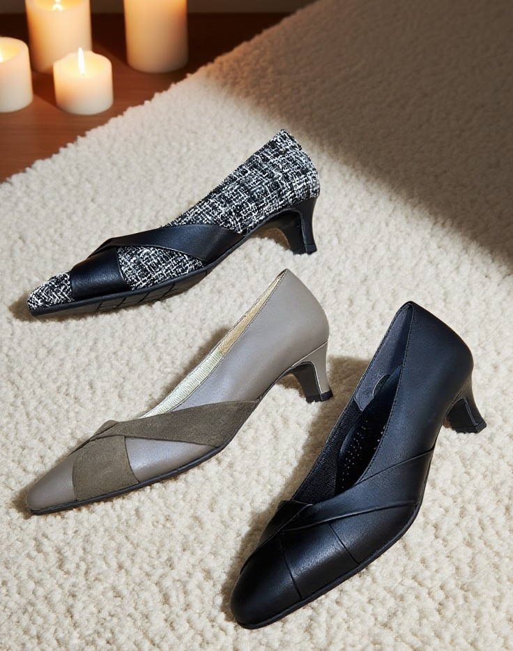 クロスのレイヤードがきっちり印象!コーデしやすいシンプルデザイン。足裏に心地良いフィット感「4cmヒールパンプス」通勤もお出かけもコレ1足!