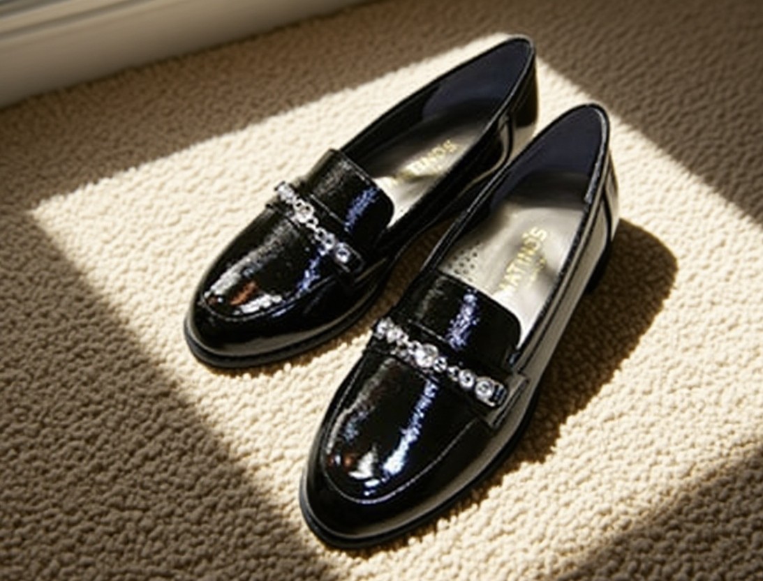 ラインストーンがキラッ!可愛いチェーンビット。シンプルSTYLE エナメル革ローファーは軽くて柔らか、履き心地快適!